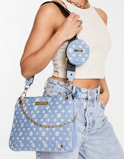 River Island Denim Monogram Cross Body Bag With Pouchette In Light Blue Asos